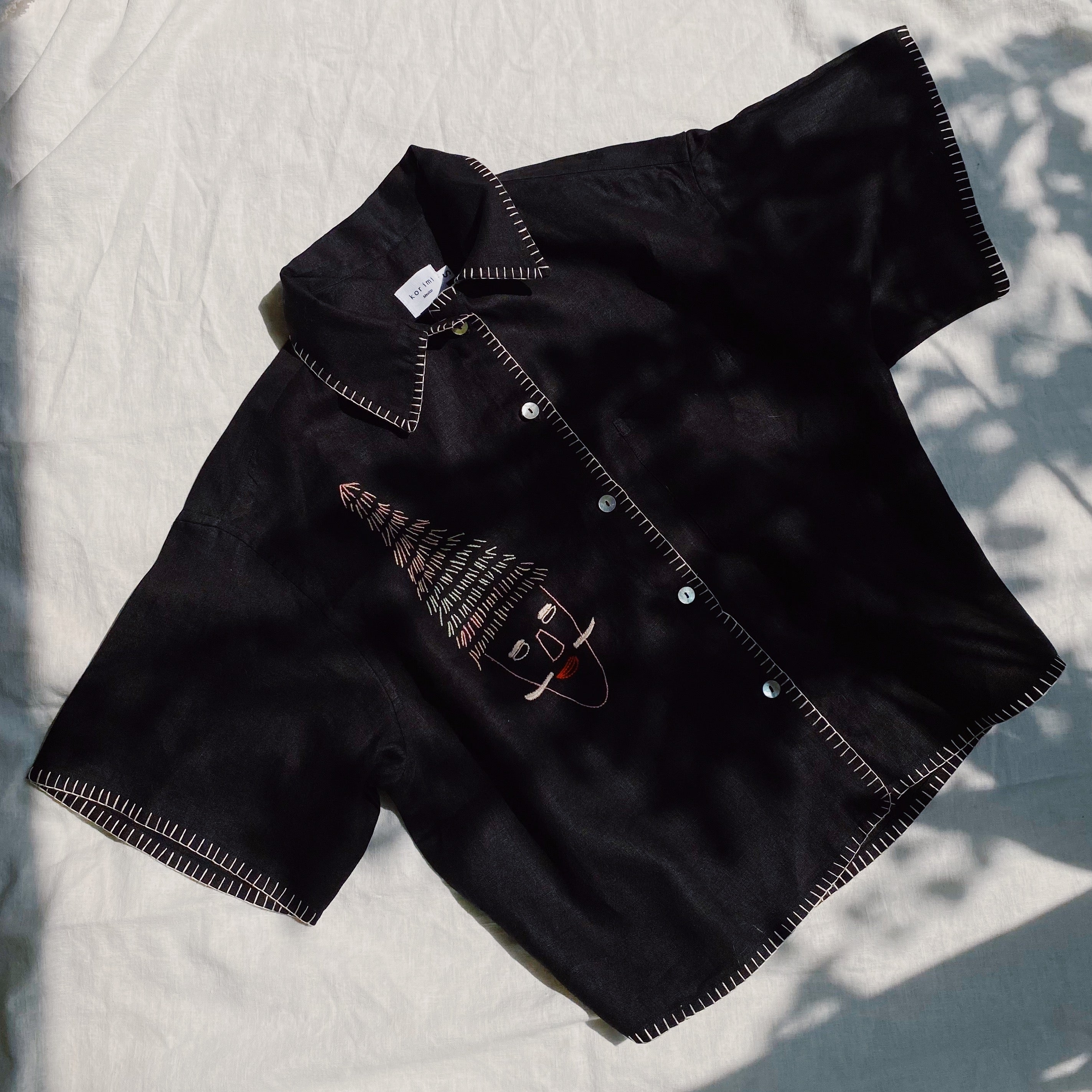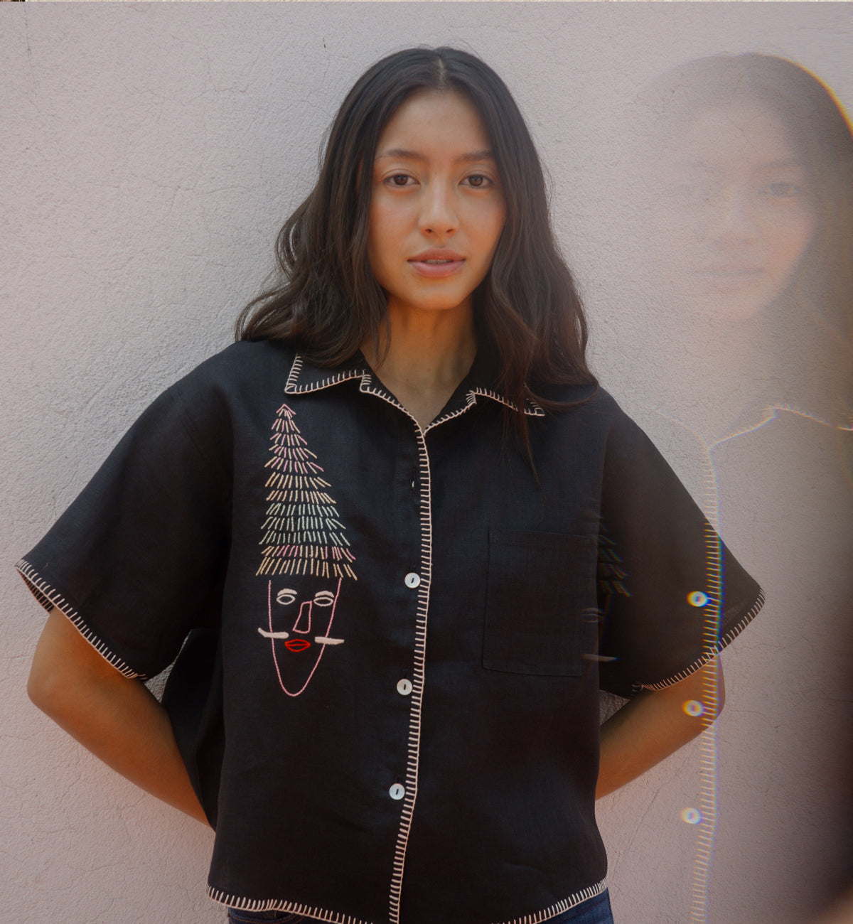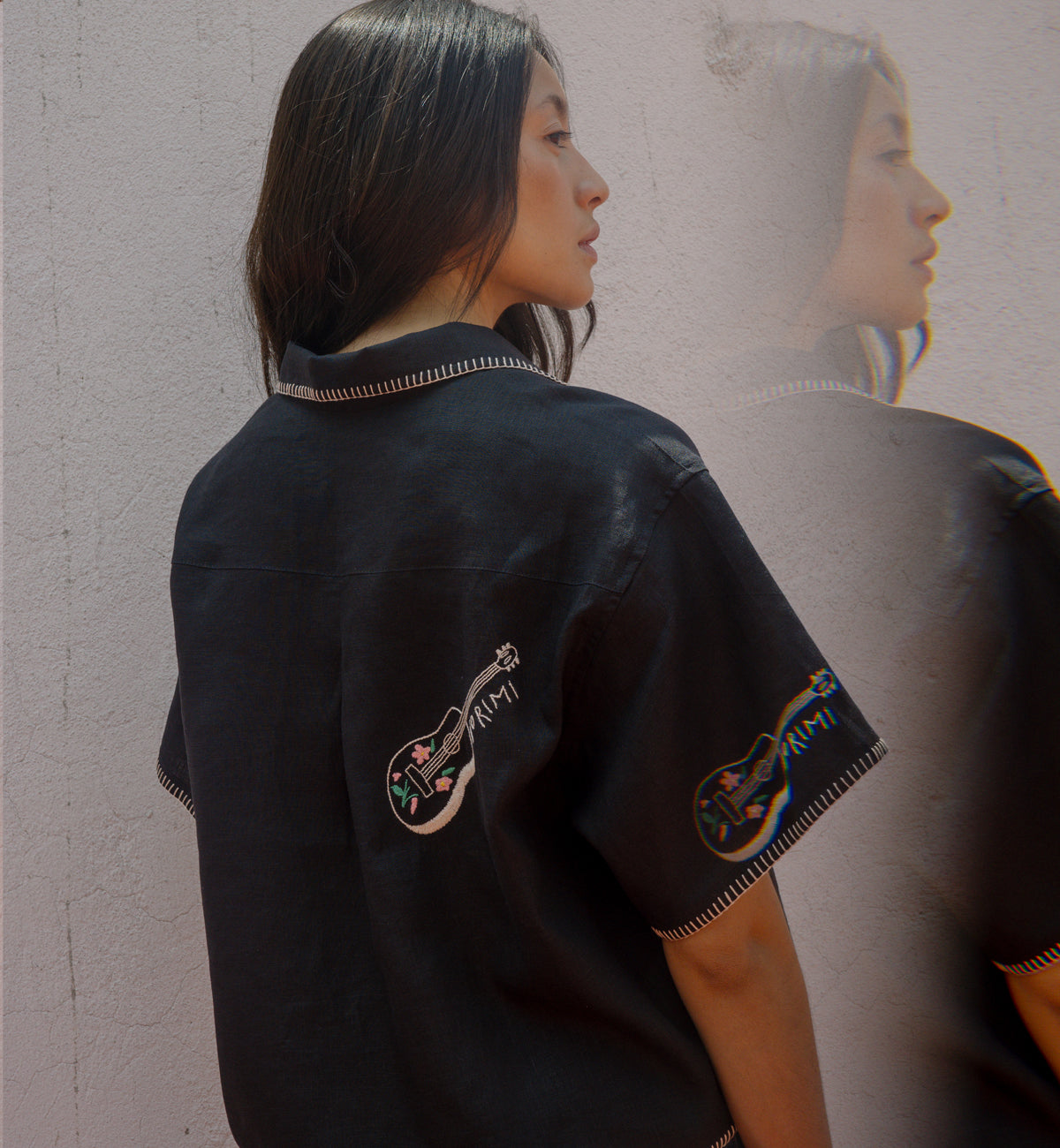 This unique shirt pays homage to the lively traditions of the Mexican carnival. The Fariseo Shirt is a tribute to the Pima community in Tonichi, Sonora and their festive observance of Lent during Holy Week. Hand embroidered, it boasts a 70's mask design on the front and a guitar on the back, with playful ivory blanket stitching. The intricate embroidery process takes a minimum of 18 hours.