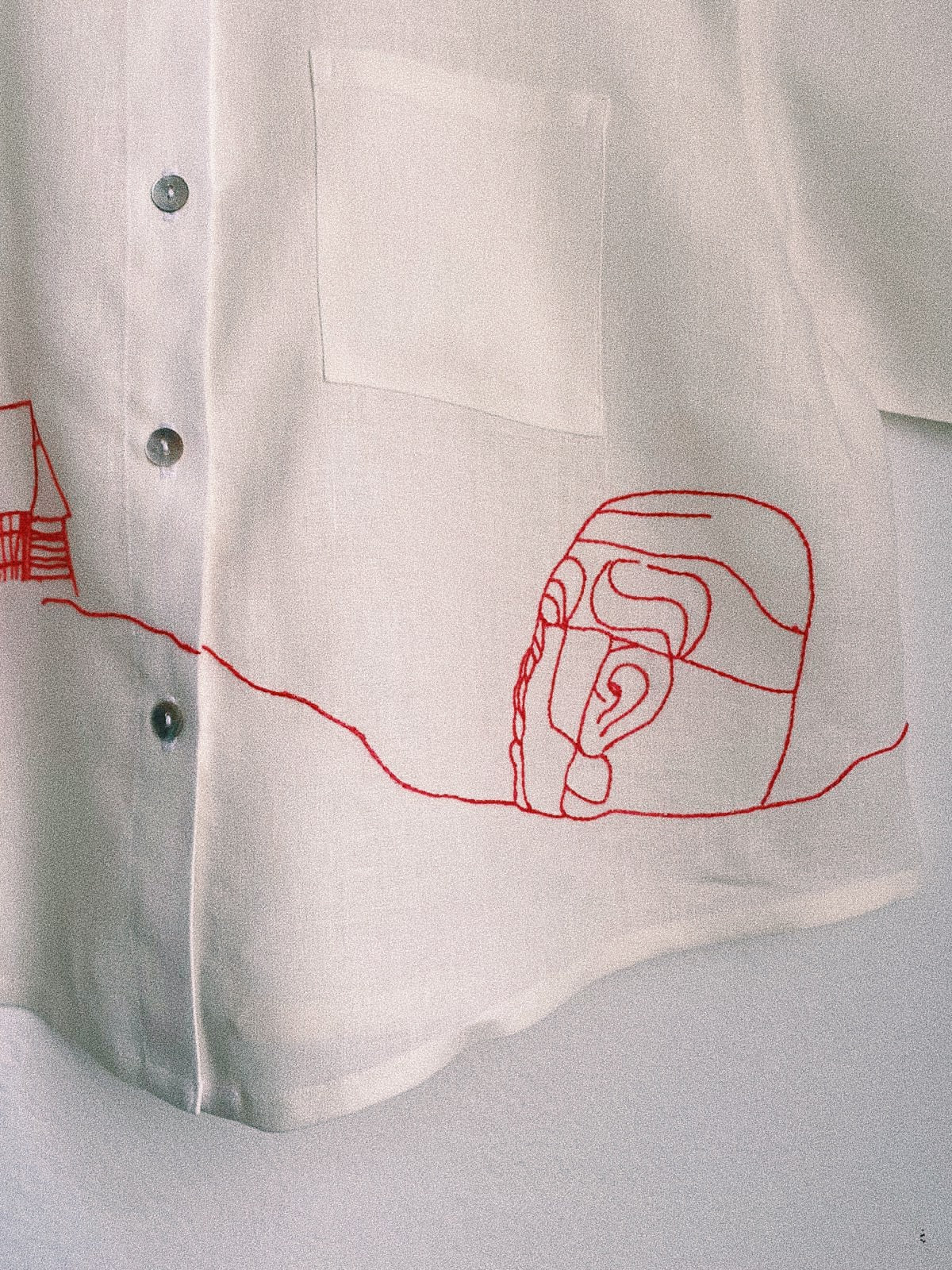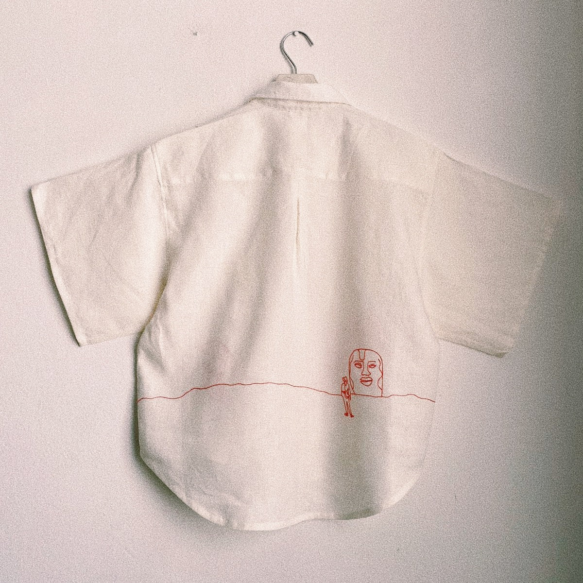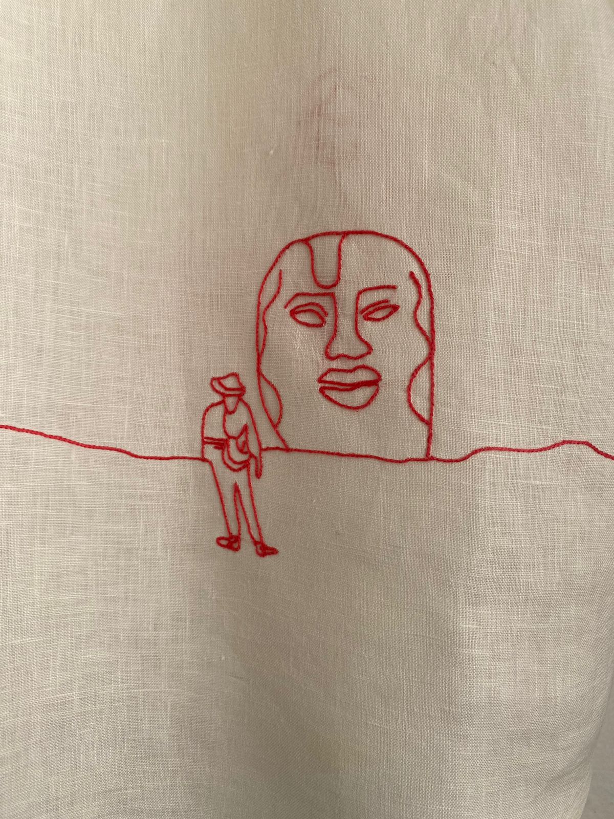 This shirt is inspired and honors  the perfection of The Colossal Olmeca heads at La Venta Tabasco. It is hand embroidered with pink thread in Mexico by a group of female artisans and features shell buttons at the front.
