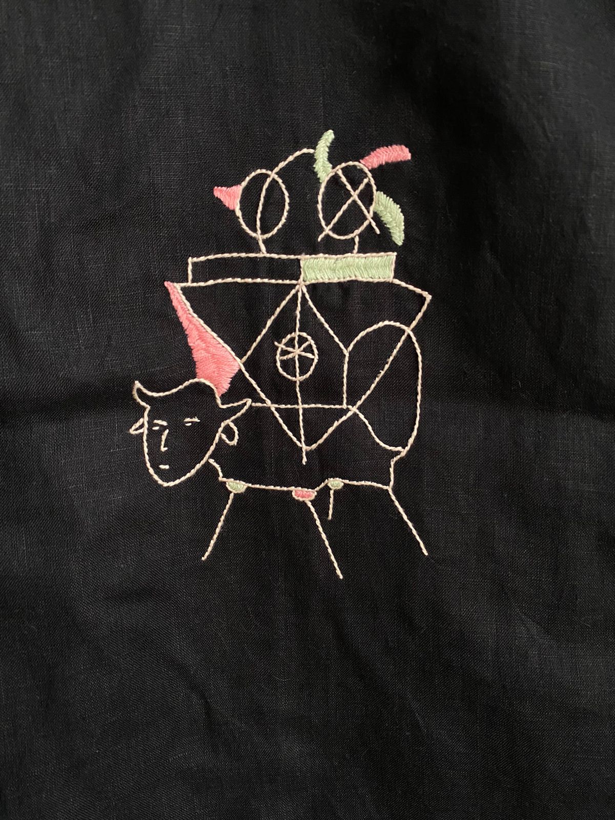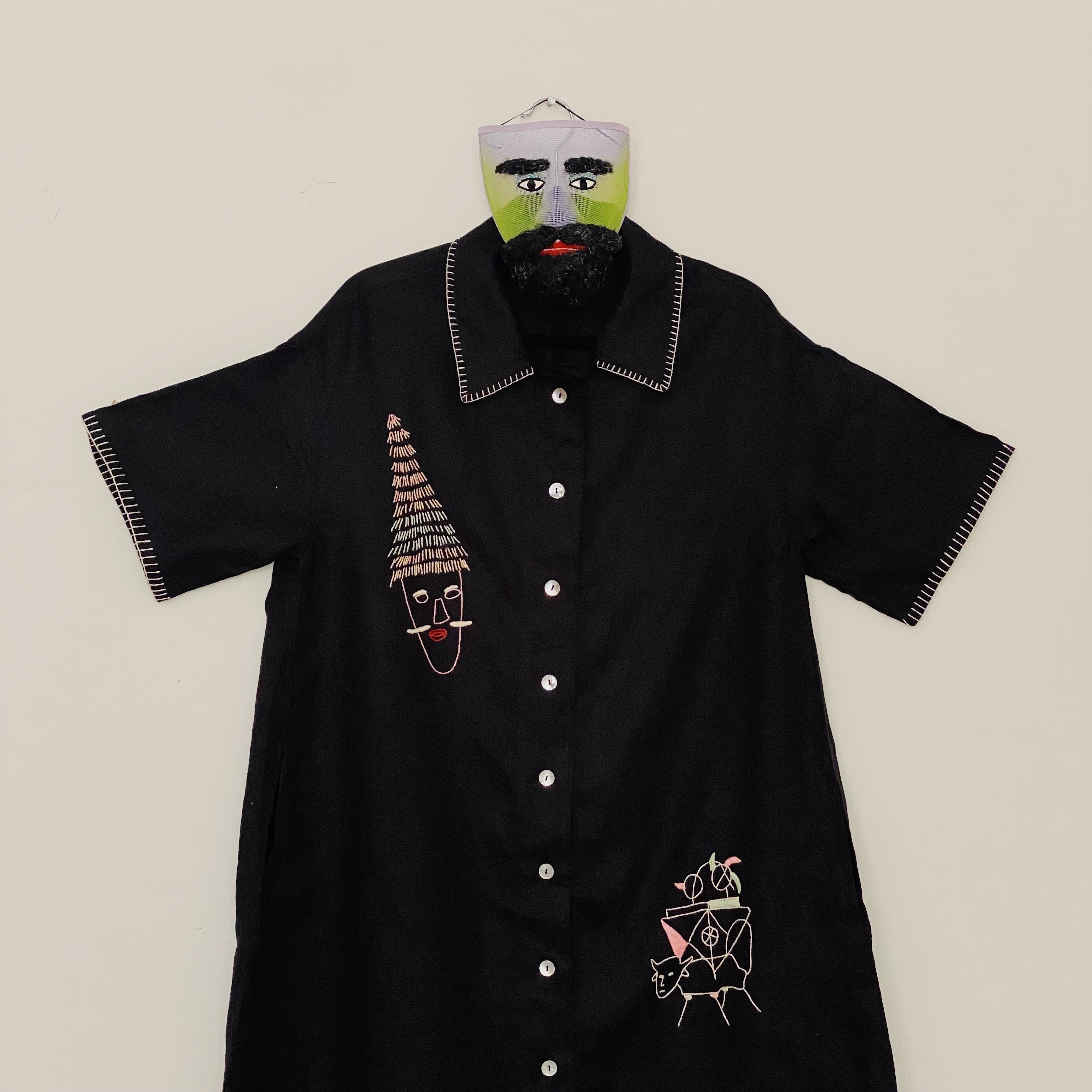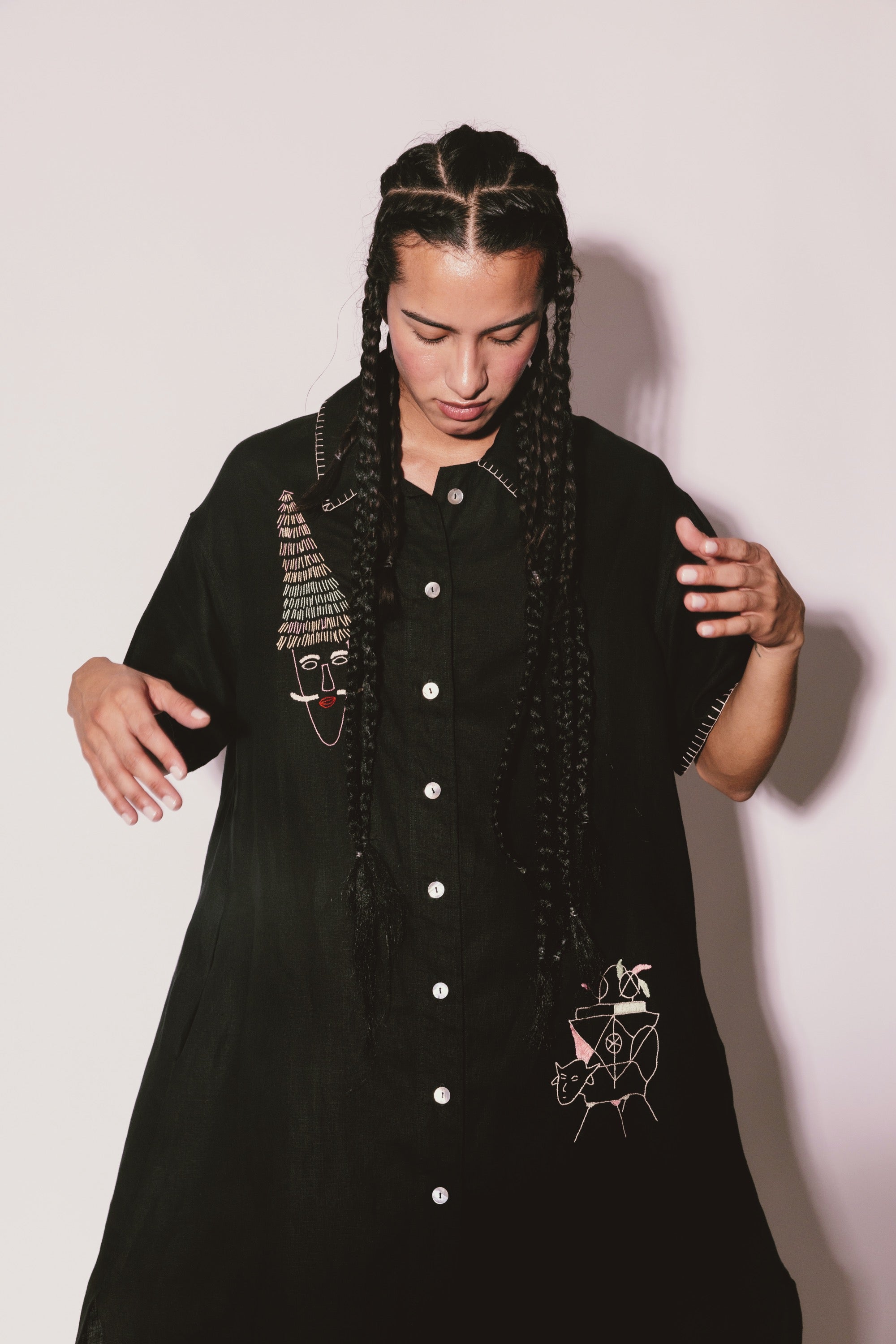 Wearing our Fariseo Tunic hat offers both comfort and style is like joining the lively carnival traditions of Mexico. It's a tribute to the Pima culture of Tonichi, Sonora, and its festive Cuaresma celebrations during Holy Week. This piece features hand-embroidered details of a 70's mask, a dazzling Torito firework on the front, and a playful guitar on the back.