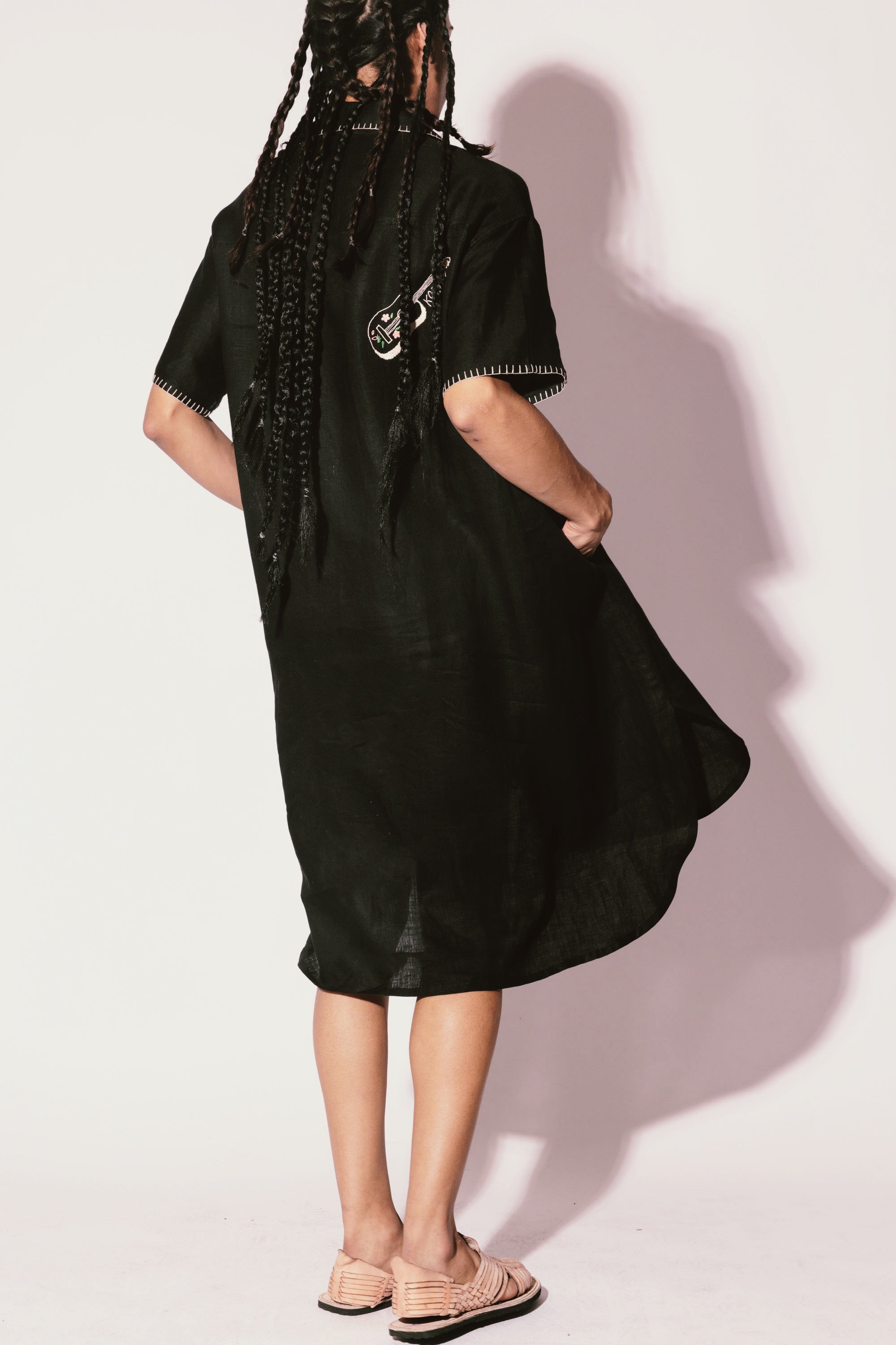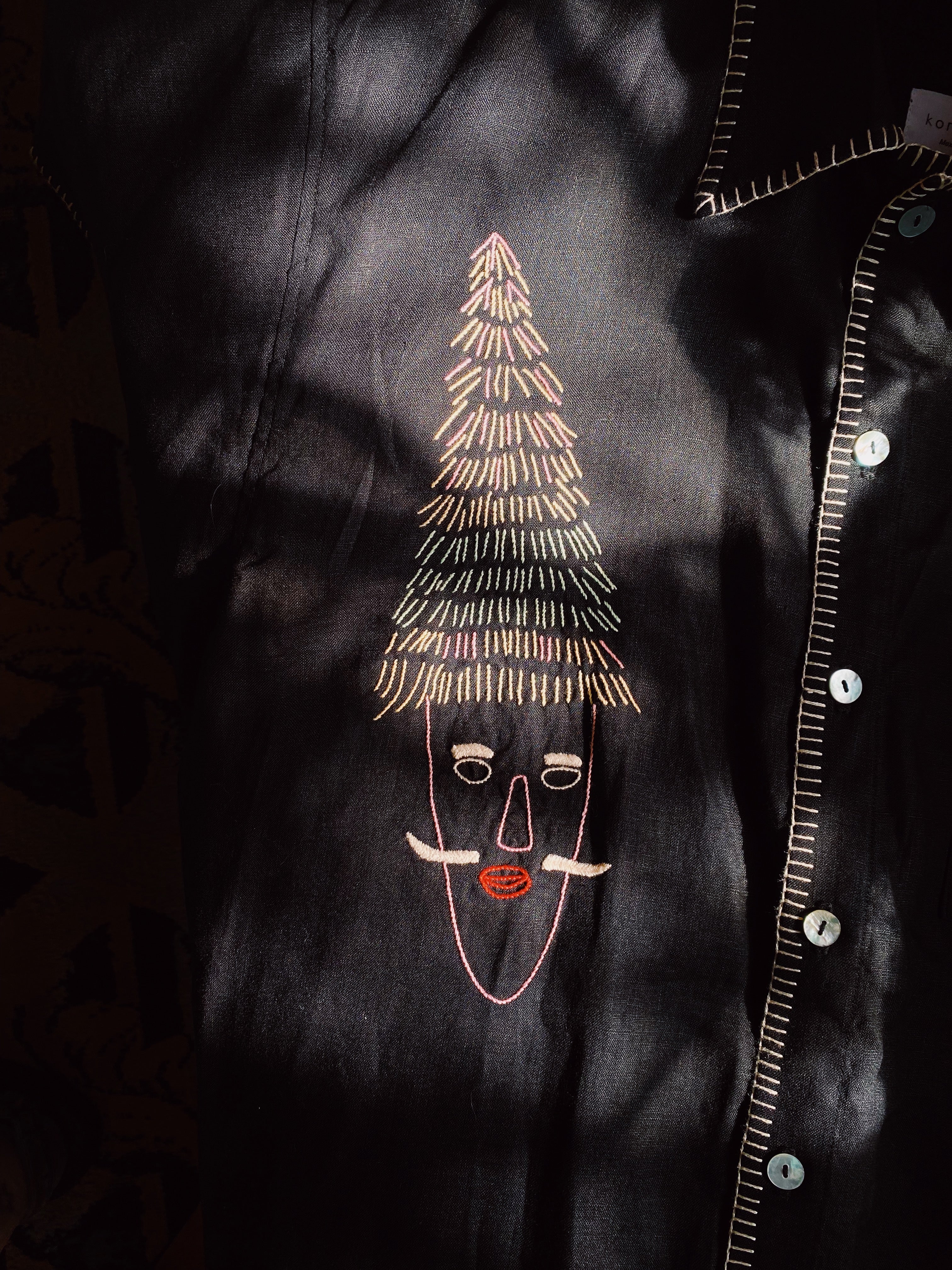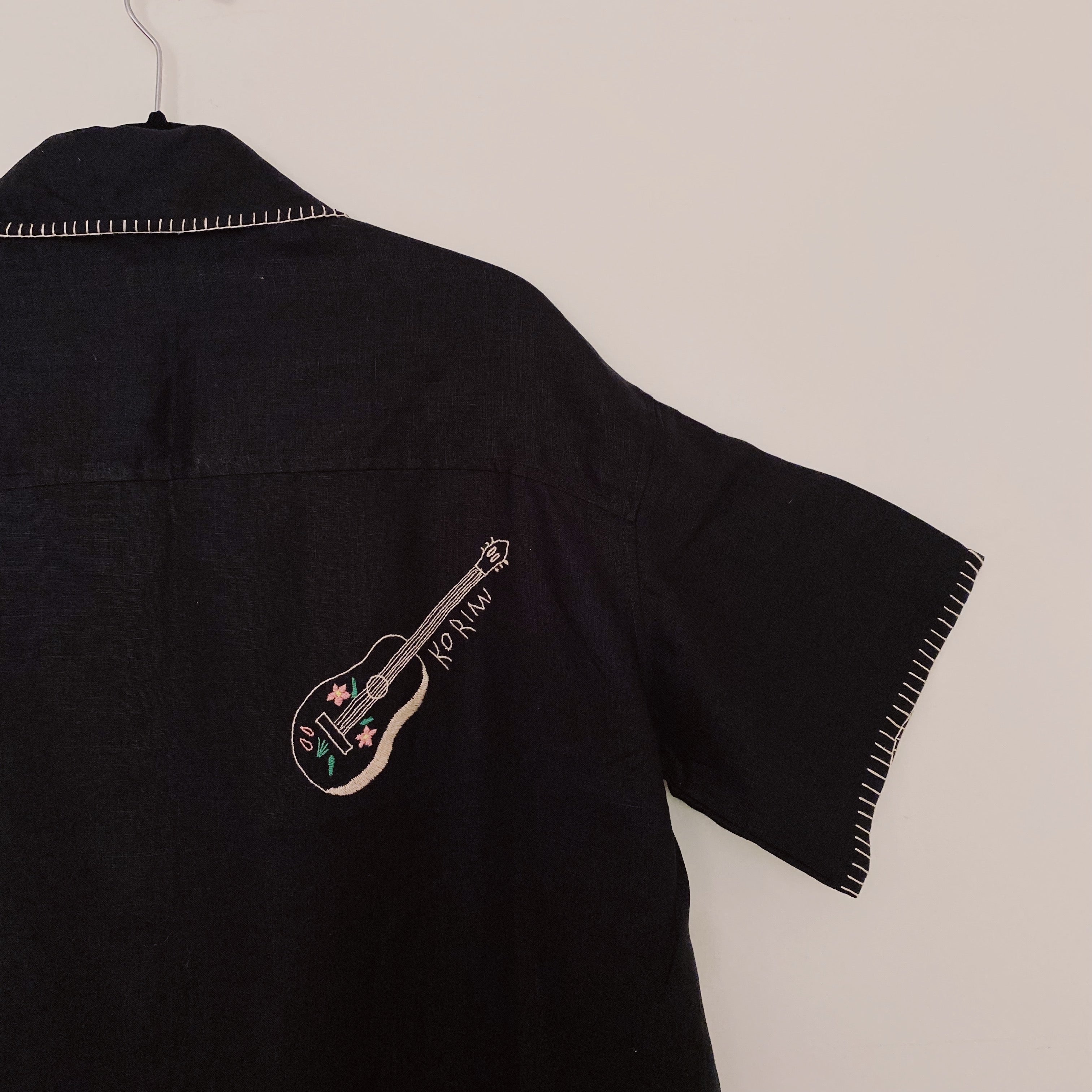 Wearing our Fariseo Tunic hat offers both comfort and style is like joining the lively carnival traditions of Mexico. It's a tribute to the Pima culture of Tonichi, Sonora, and its festive Cuaresma celebrations during Holy Week. This piece features hand-embroidered details of a 70's mask, a dazzling Torito firework on the front, and a playful guitar on the back.