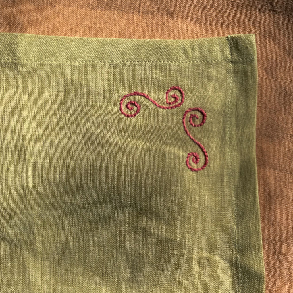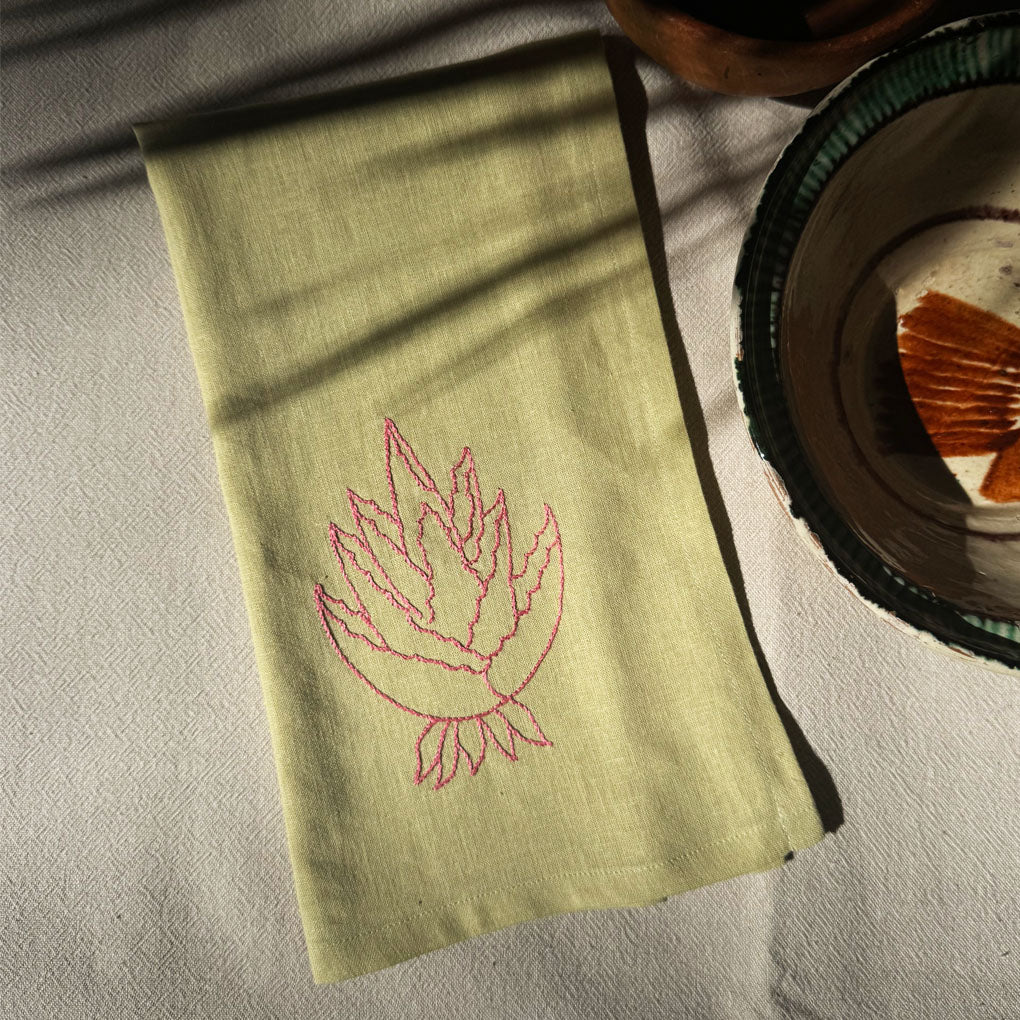 Light green linen cloths, hand-embroidered with traditional Mexican agave and delicate spirals in the corners in pink. A piece that honors the land and the art of embroidery. Perfect for dressing your table and filling your home with timeless tradition and beauty.
