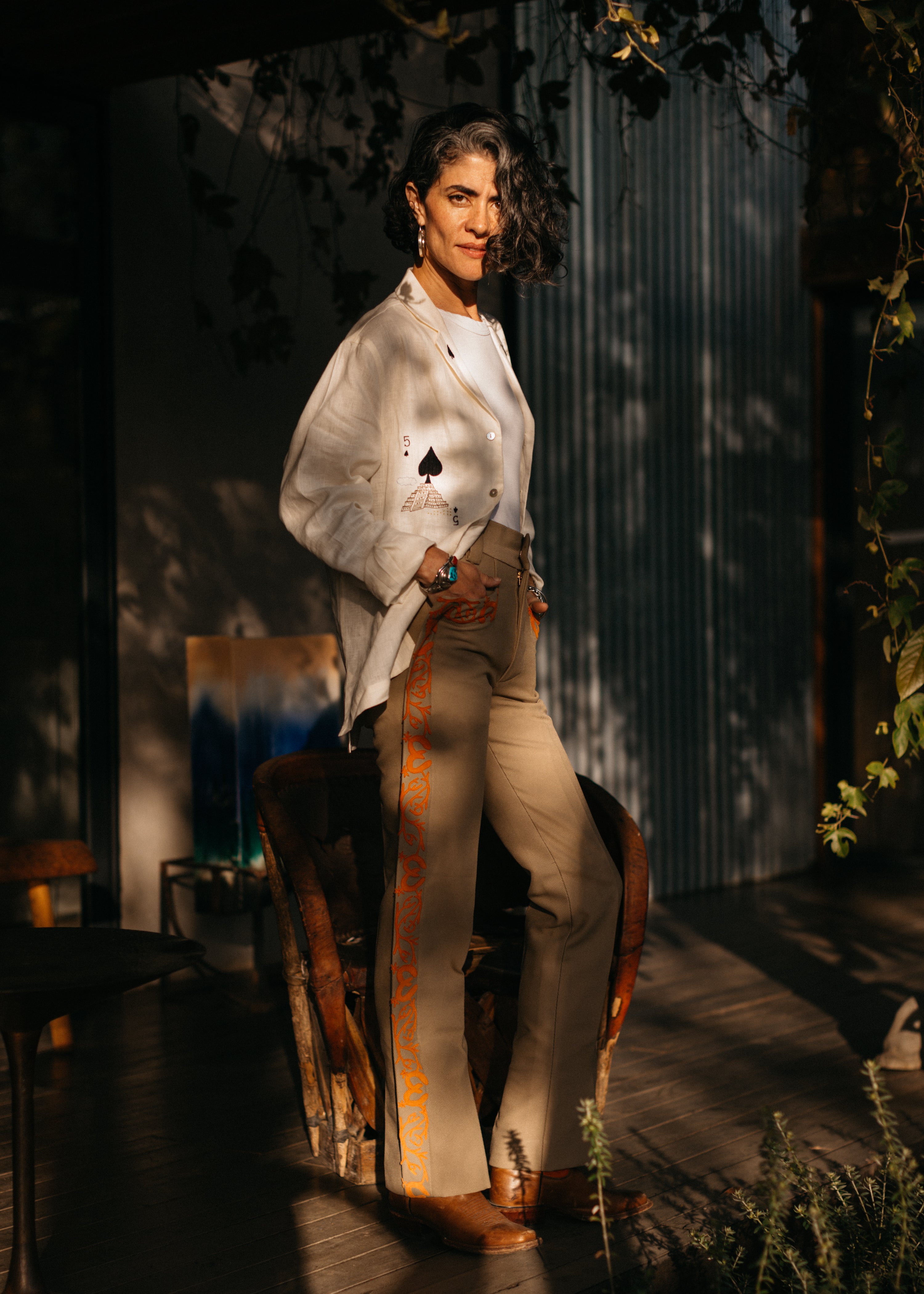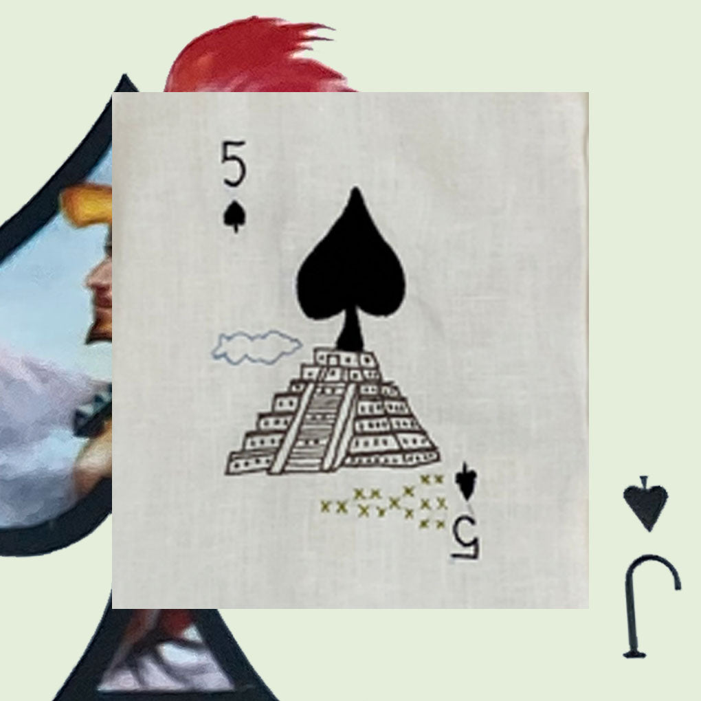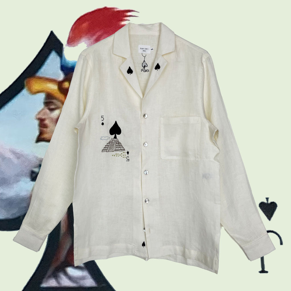 Our Barajas shirt, inspired by a 1970s deck of playing cards featuring pre-Hispanic motifs. This linen piece showcases hand-embroidered details of the Pyramid of Teotihuacan and the five of swords, with each shirt taking 6.5 hours of meticulous craftsmanship. The embroidery extends to the front, buttons, and back, making this shirt a true celebration of cultural heritage and artisanal mastery.