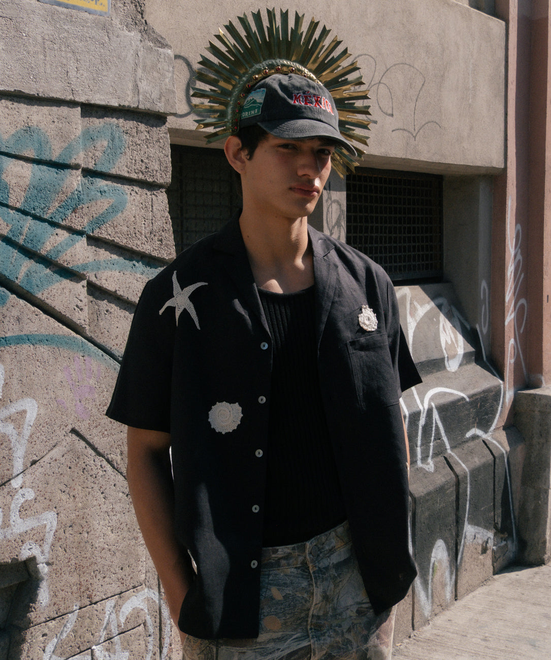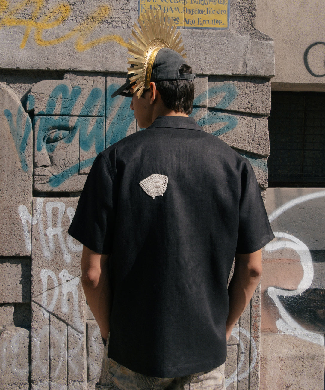 Inspired by the seashells that wash up on the shores of Cozumel, this shirt is made of black linen with hand-crocheted shell appliqués.