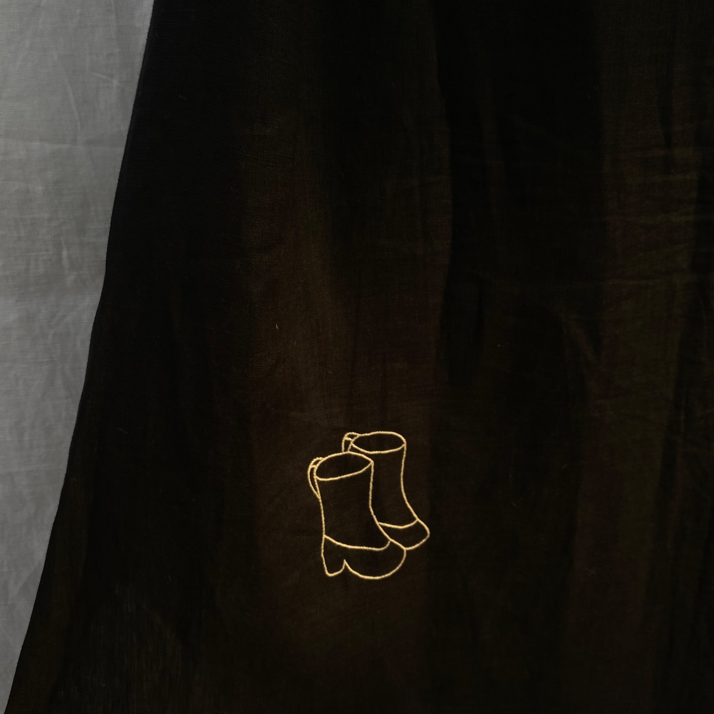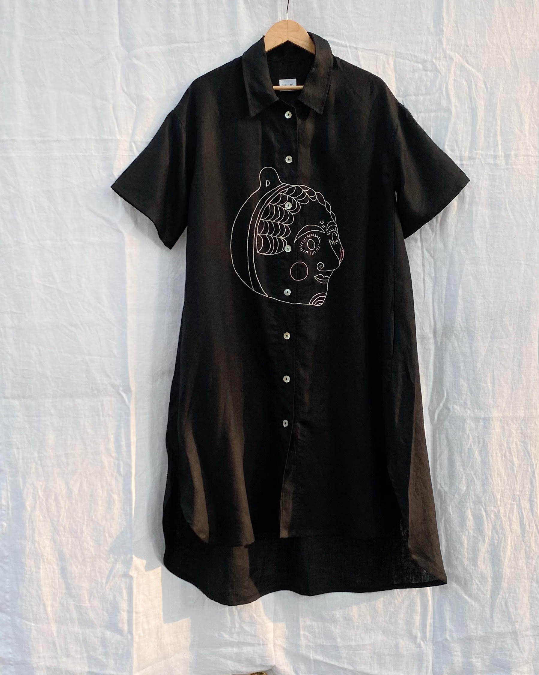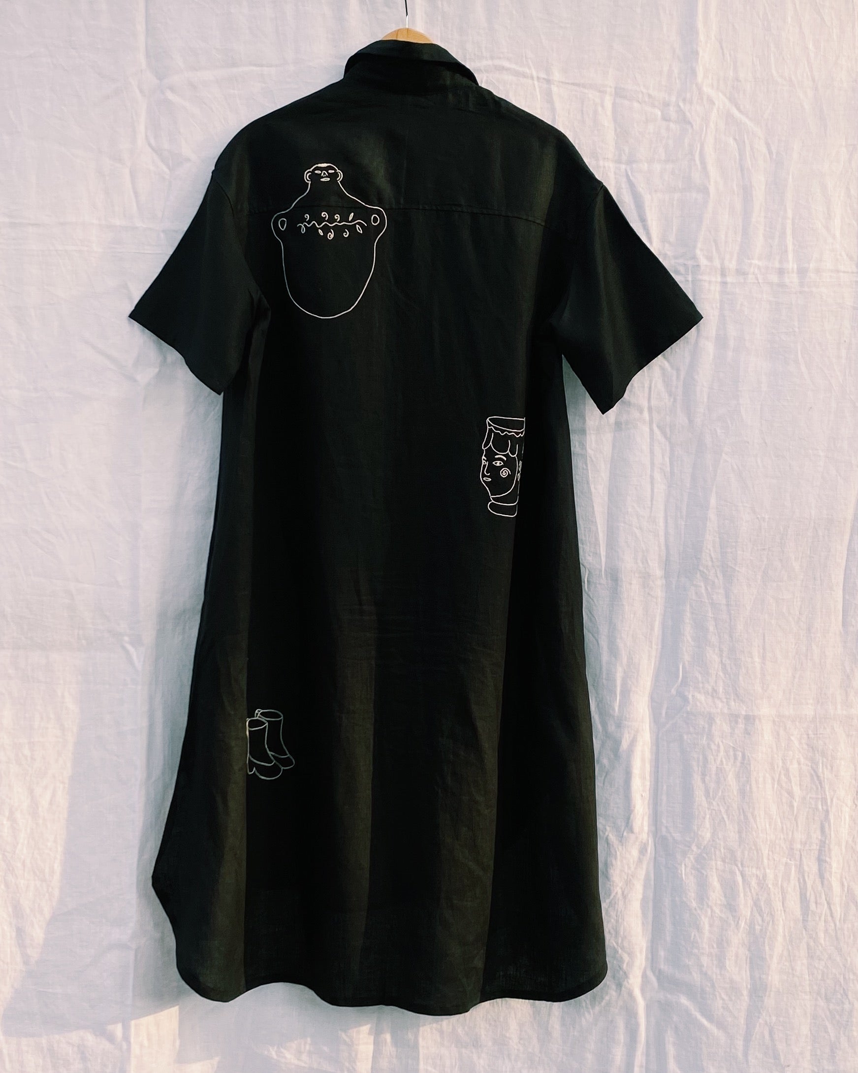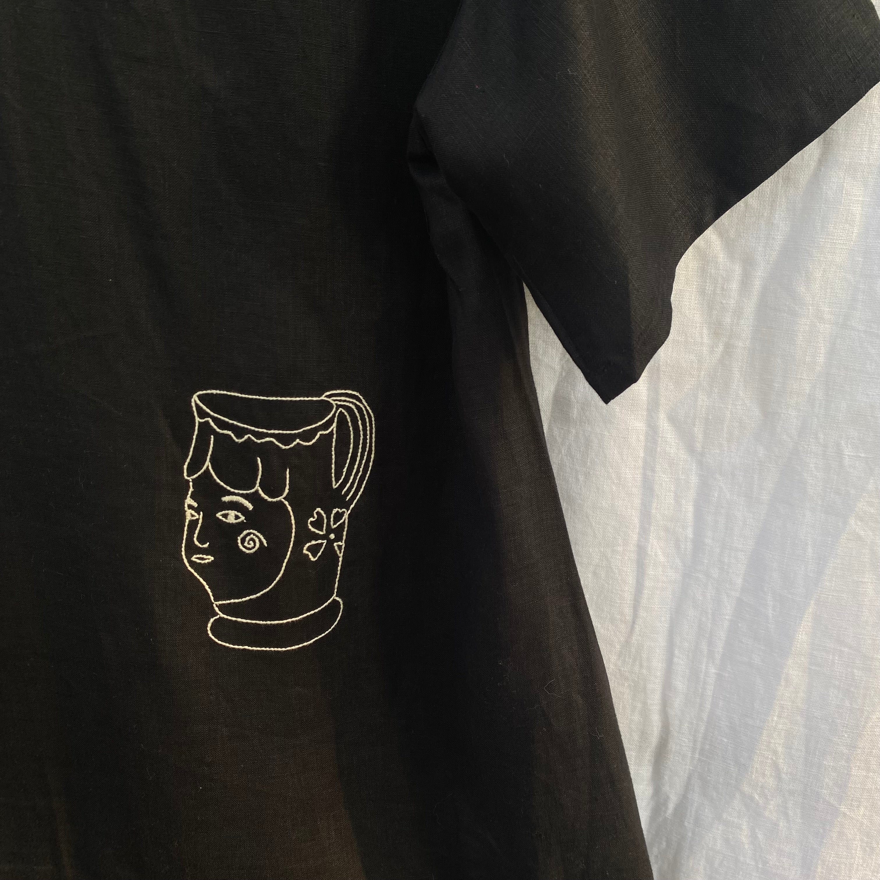 In honor of Mexico's long-standing pottery tradition, this tunic blends earth and fire elements. The front showcases a vintage Tonala face head bank, lovingly hand-embroidered. On the back, you'll find a unique water vessel from Mezcala, Guerrero, which was hand-molded and hung with a rope through its handles. The back also features a "Jarro de Carita" from Santa Fe de La Laguna, Michoacan, and adorable bootie-shaped Pulqueros vessels from Barrio de la Luz, Puebla, traditionally used to serve pulque. Crafting this masterpiece took 18 hours of careful attention.